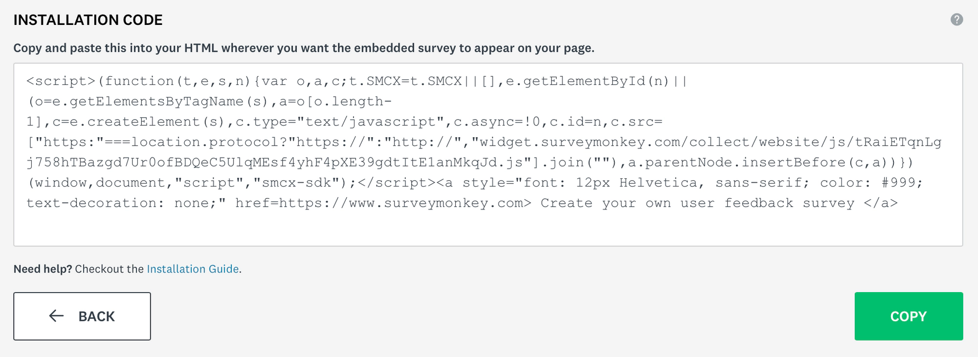 Once you’ve selected your ideal display options for the survey, hit the copy button to grab the embed code.